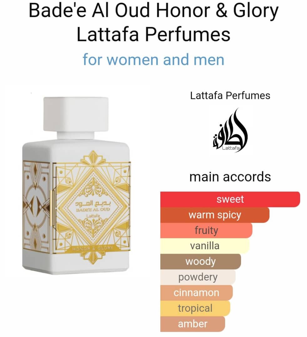 Bade’e Al Oud Honor & Glory (sometimes spelled Honor & Glory) is a unisex oriental-gourmand Eau de Parfum from Lattafa, launched circa 2023. It is part of Lattafa’s “Bade’e Al Oud” collection, which plays on the idea of refined Middle-Eastern luxury scents. The “Honor & Glory” iteration aims to combine sweet, creamy gourmand notes with oriental spice and woods